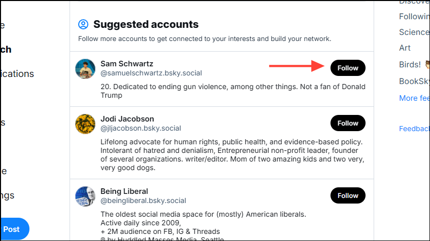 - Click on 'Search' on the left and Bluesky will suggest user accounts you can follow.