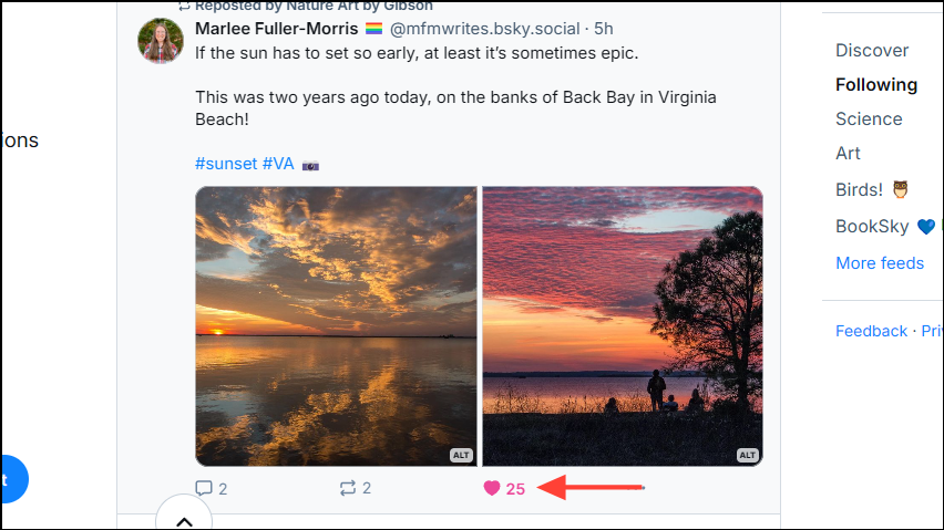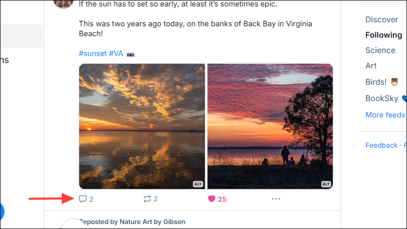 - Posts from accounts you follow will show up in your 'Following' feed. You can then interact with them in various ways. For instance, you can 'like' a post in a feed by clicking on the 'heart' icon below it.