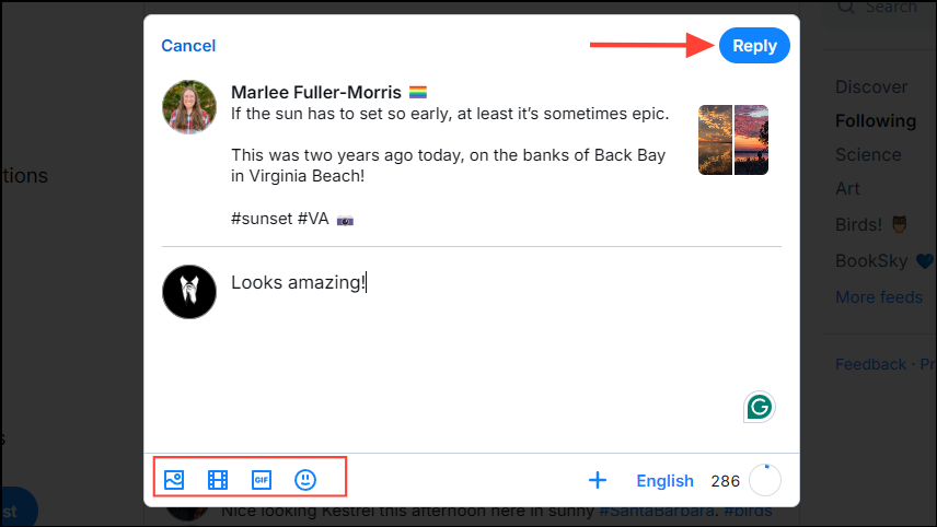 - Then type your reply in the box that appears. You can also add images, videos, emojis, and links to the reply using the buttons on the bottom left of the text box. When you're done, click on the 'Reply' button.