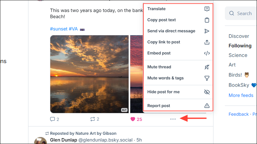 - You will find a lot of other ways to interact with posts in your feed by clicking on the three-dot icon on the right below a post.