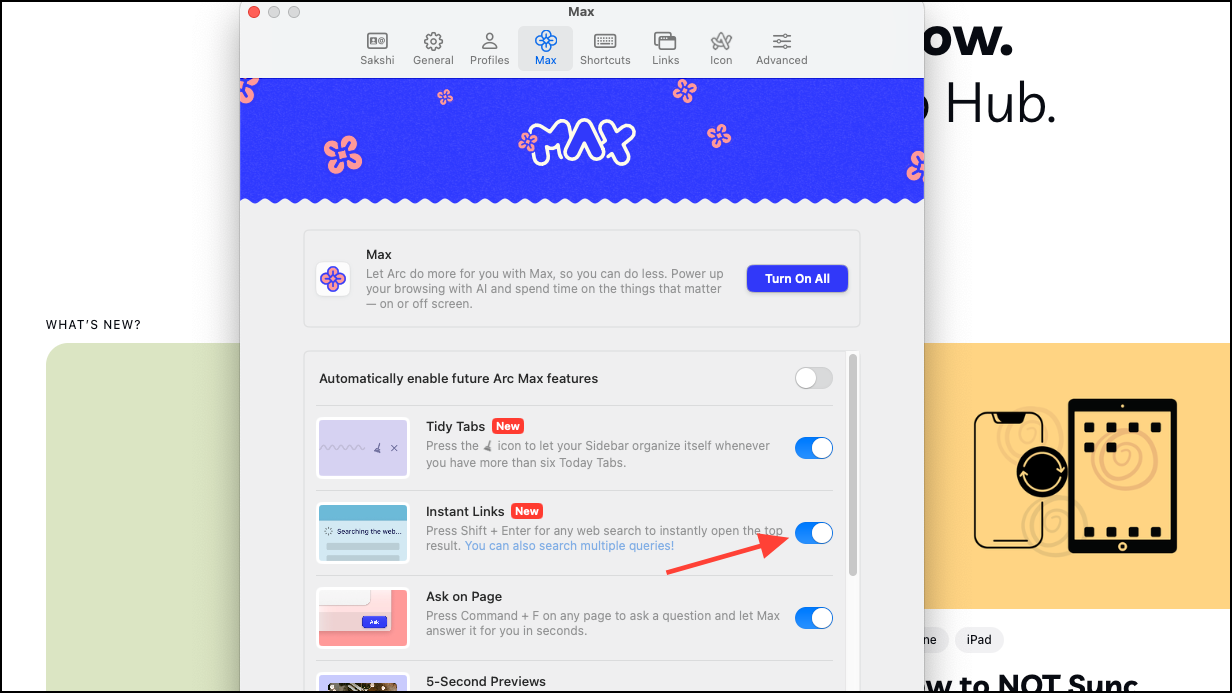 If you want to enable future Arc Max features by default when they are released, enable the toggle for 'Automatically enable future Arc Max features' as well.
