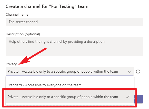 The window for creating a channel will open. Name the channel, and provide a description for it if you want. Then, go to the option for ‘Privacy’. By default, it will show the privacy settings as ‘Standard’. Click on it to expand the drop-down menu, and select ‘Private’. Click on ‘Next’ to complete the creation.