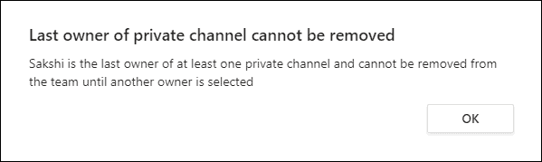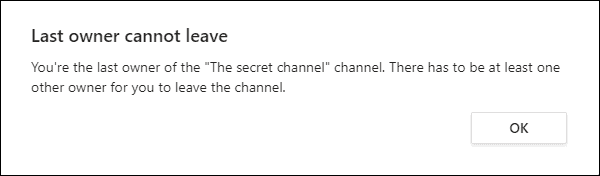 You can’t also leave a team if you’re the last owner of any private channel in the team, nor can you be removed from the team by the team owner. You’ll have to make someone else owner in your place to leave the private channel or the team.