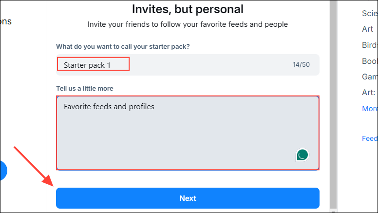 - Enter a name for your starter pack and then describe what the starter pack is about before clicking on the 'Next' button.