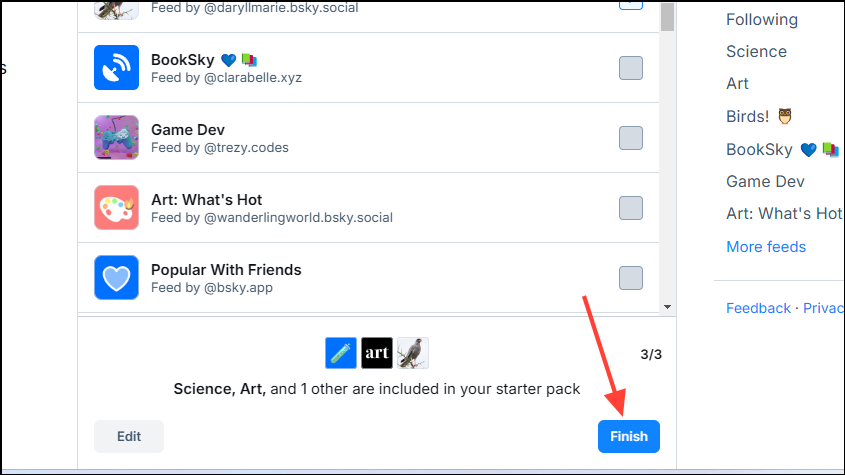 - Next, you can select feeds for the starter pack. Select three feeds and click on the 'Finish' button.