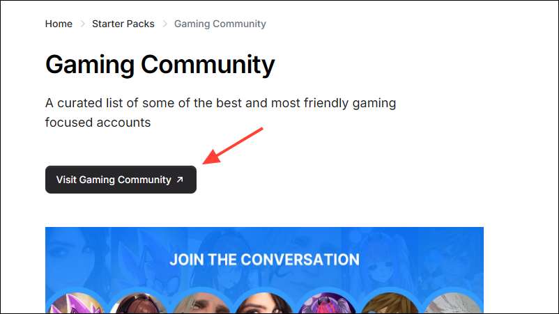 - After selecting a starter pack, you can directly view it on Bluesky by clicking on the black 'Visit [Starter pack name]' button.