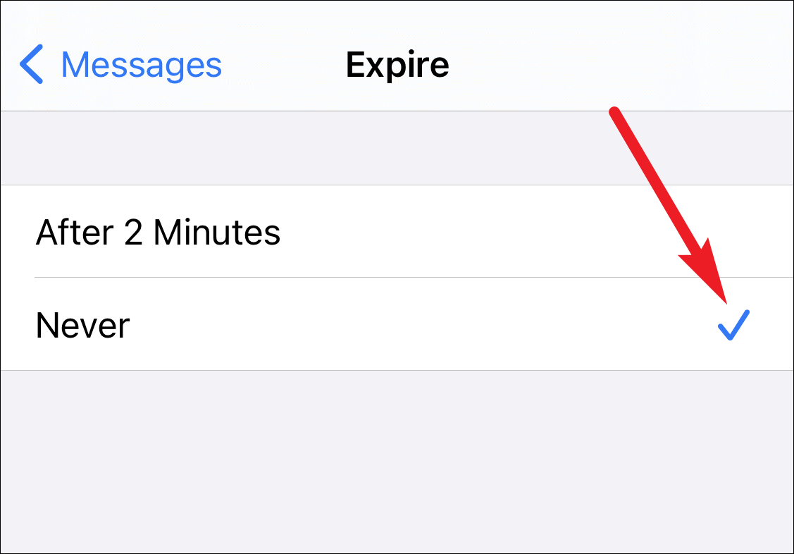 - You'll see two options: After 2 Minutes and Never. Select Never to ensure that your voice messages do not expire.