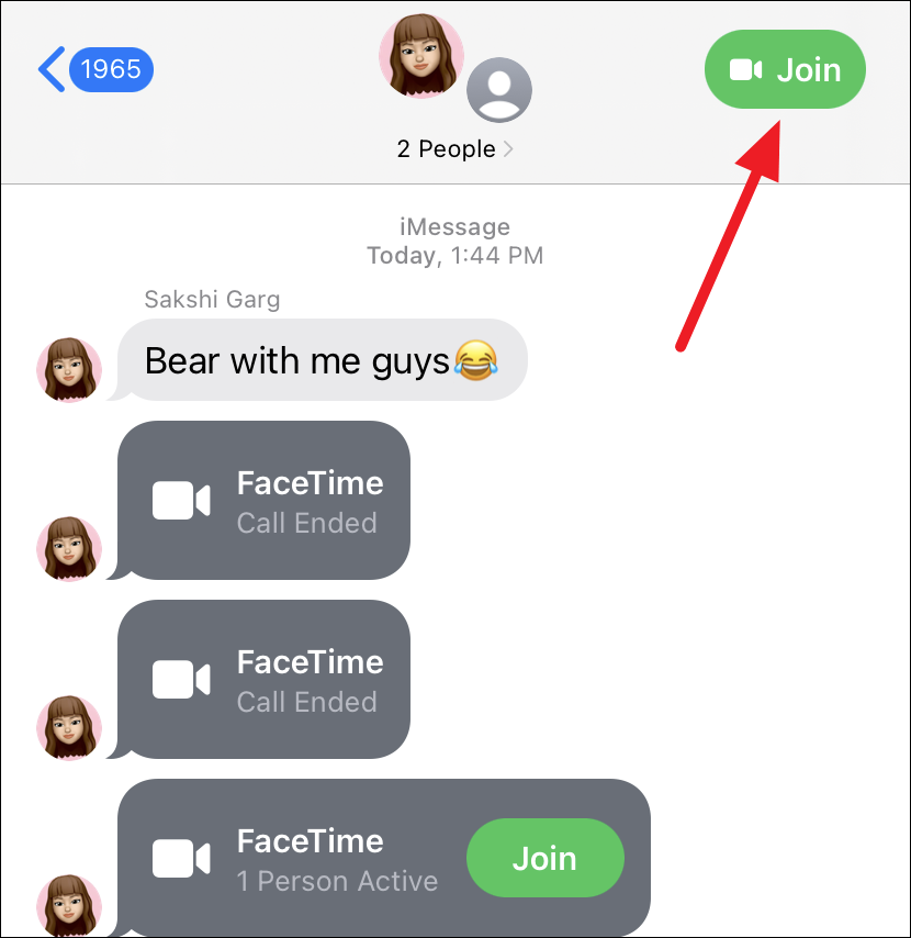 In an iMessage group chat, spotting a green 'Join' button in the upper-right corner means that other members have started a group FaceTime call directly from the chat.