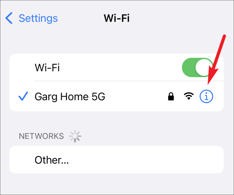 Then, tap the ‘i’ (information) button next to the Wi-Fi network to open more details.