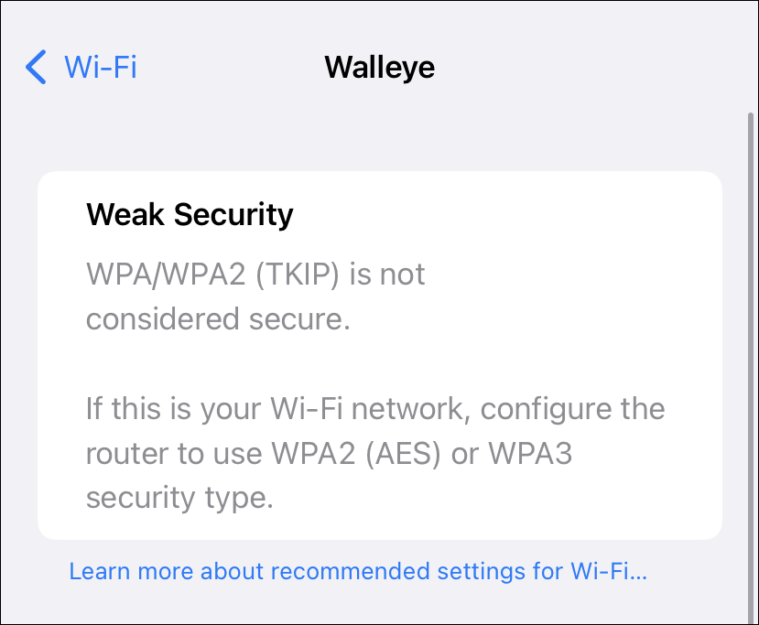 Although seeing a Weak Security message on your Wi-FI network is not a cause for immediate concern, it does flag an underlying problem. And the best course of action is to change the security settings for your router as soon as you can. If you don’t, you’ll be vulnerable to attacks weaker Wi-Fi security exposes you to. Changing the security settings kills two birds with one stone. It makes your network more secure, while also ridding you of this annoying message on your iPhone.
