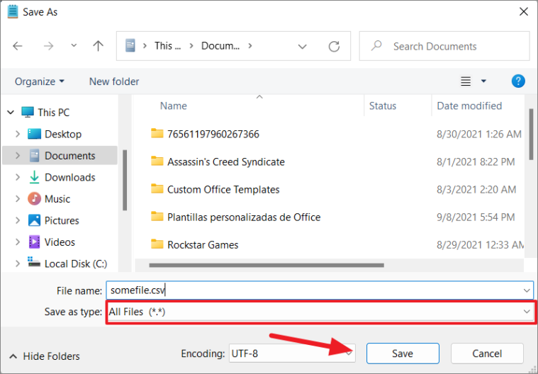 Next, select the ‘All Files (*.*)’ option from the ‘Save as type’ drop-down, then click the ‘Save’ button.