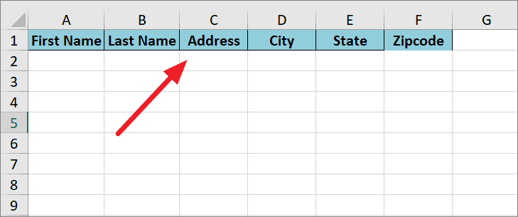 To create a new document for CSV, first, add a column header or a field name for each piece of data you want to insert (e.g. first name, last name, address, city, state, and zip code) into the cells located in row 1 at the top of the worksheet.