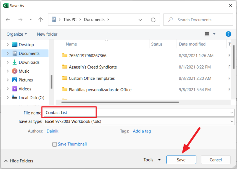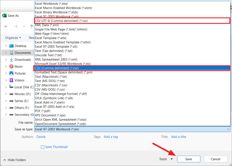 Then, choose ‘CSV UTF-8(Comma delimited) (*.csv)’ or ‘CSV (Comma delimited) (*.csv)’ format from the ‘Save as type:’ drop-down and click the ‘Save’ button.