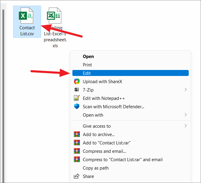 To open a CSV file in Notepad or your default text editor, right-click the CSV file in File Manager or Windows Explorer, and then select the ‘Edit’ (If you have Windows 11, select ‘Show more options and then select ‘Edit’). Alternatively, you can right-click the file, move the cursor over to the ‘Open with’ option, and then select ‘Notepad’ or any other text editor.