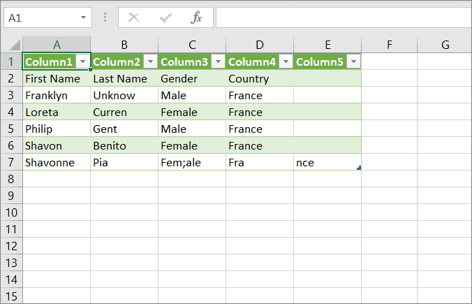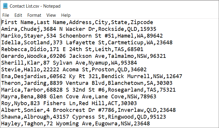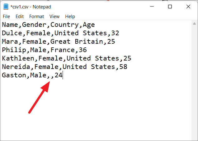 Continue writing your values for each item onto each following line. If you want to leave any fields (value) empty, make sure to add the comma, or the remaining fields in the line will be shifted left when you import the file into a table. In the below example, we left out the country field in the 7th line, but we added a comma to leave a blank cell when we covert the data into the table.