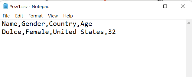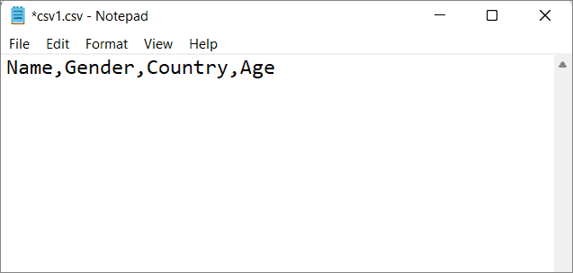 First, open a text editor like Notepad, then enter the column names or first row of data (a record) separated by commas onto the first line. For example, we’re typing the following headers in the file line: