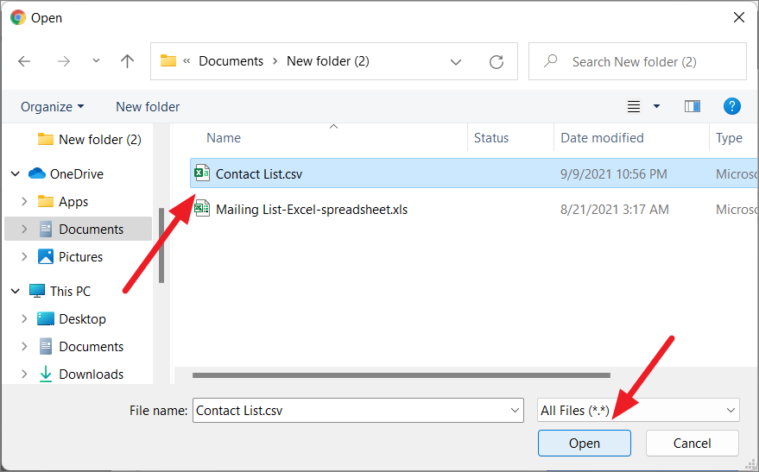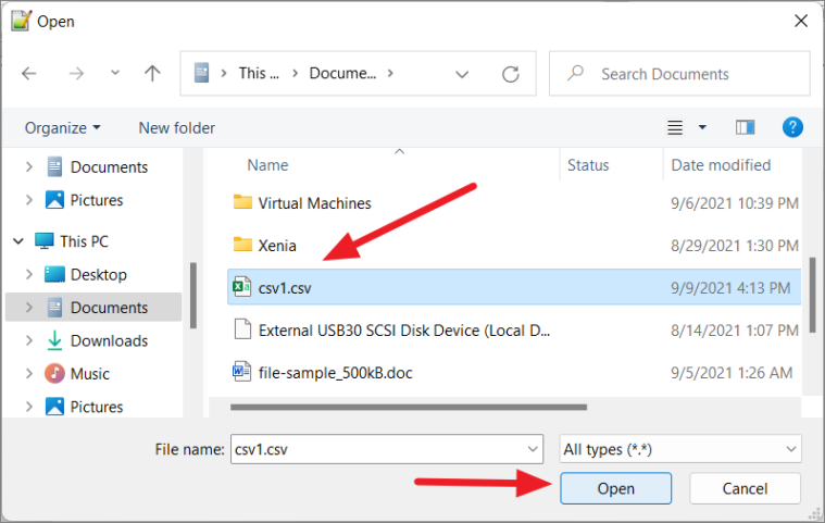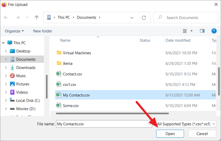 Then, find the CSV file you want to open on your local drive, select it, and click ‘Open’ to upload the file.
