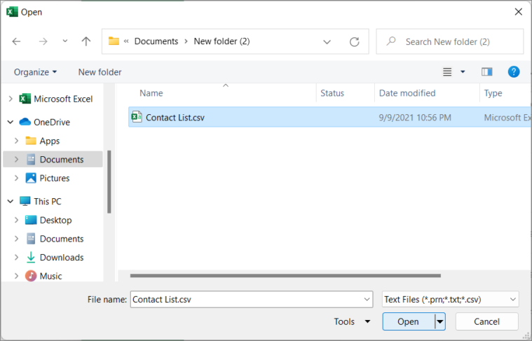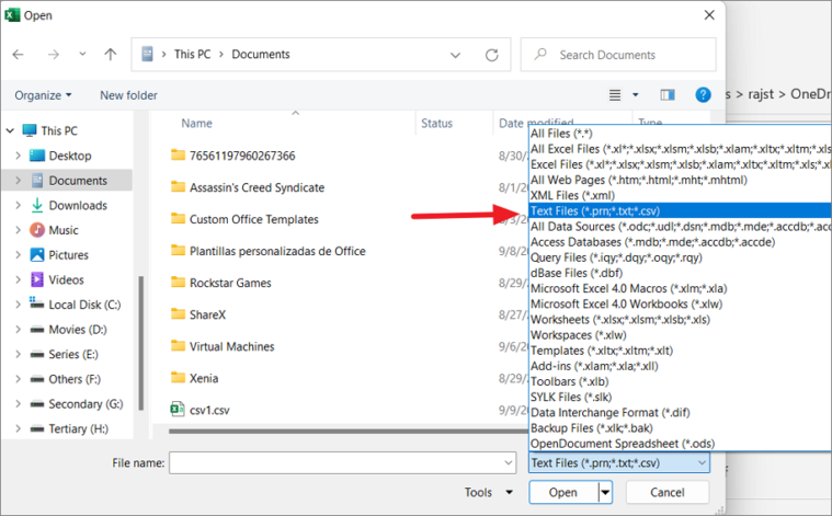 In the ‘Open’ window, navigate to the location that contains your CSV file. If you can’t find the file you want to open, click the drop-down menu next to the ‘File name’ field and change the file type to ‘Text Files (*.prn, *.txt, *.csv)’. This will show only the text files in the selected location.