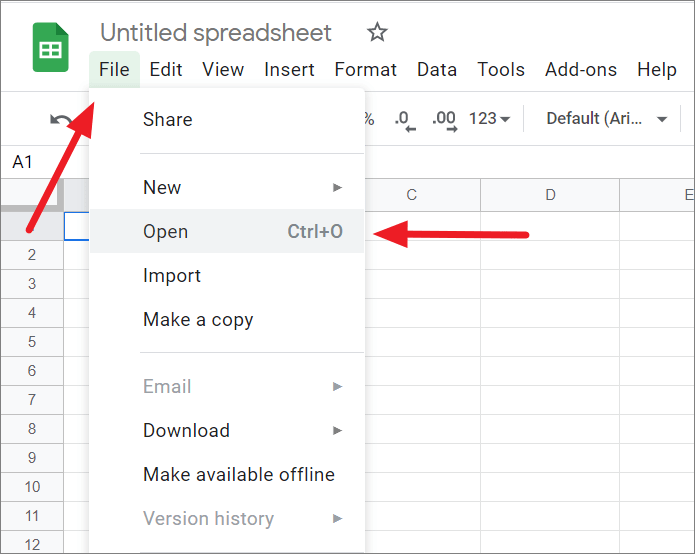 First, open a blank spreadsheet file in Google Sheets. In the menu bar, click ‘File’, and click ‘Open’.