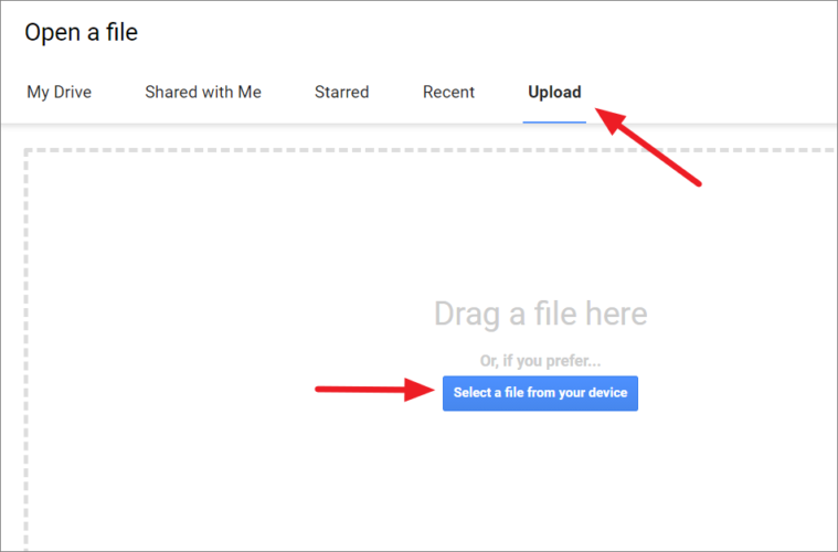 In the Open a file dialog box, select the ‘Upload’ tab and click the ‘Select a file from your device’ button. Or, if you have already uploaded your CSV file to your Google Drive, then select it from the ‘My Drive’ tab and click ‘Open’. You can also drag and drop the file from your computer into the ‘Open a file’ dialog window.