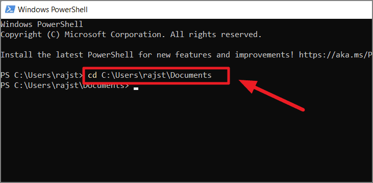 First, open Windows PowerShell and use the ‘cd’ command to change the directory to the one where your CSV file is located. For example, we’re using the following command change directory in our system: