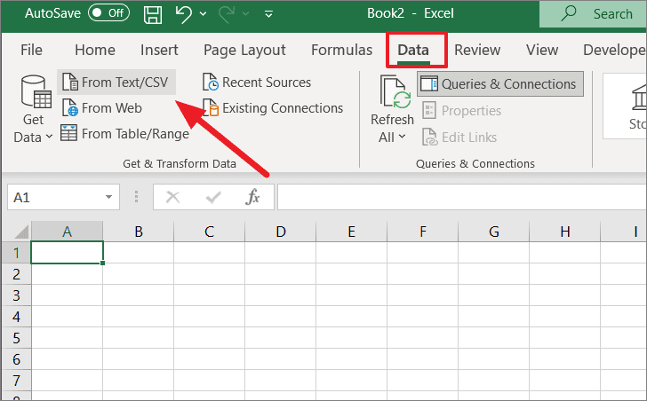 To import data in Excel, open the Excel program and create a new workbook or open an existing one. Go to the ‘Data’ tab and click the ‘From Text/CSV’ button from the Get & Transform Data section in the Ribbon.