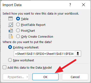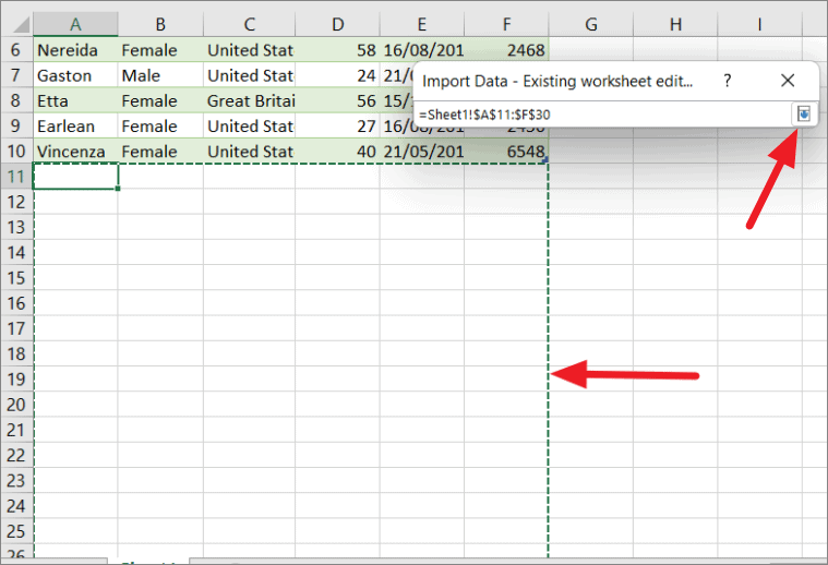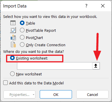 A small Import Data dialog box will appear. Here, select the ‘Existing worksheet’ option, and click the range selection button (Upward arrow) to select the range of cells.