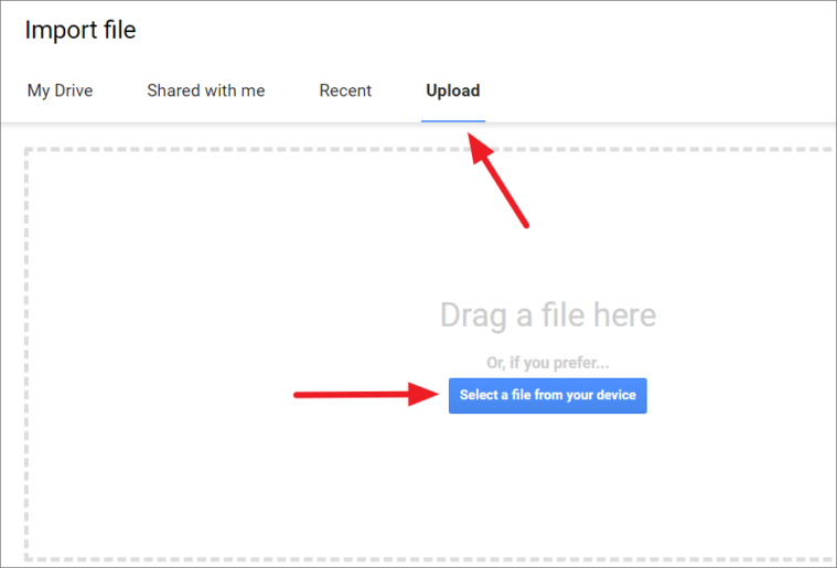 In the Import file dialog window, select the ‘Upload’ tab, and click the ‘Select a file from your device’ button or drag and drop the file here from your local drive.