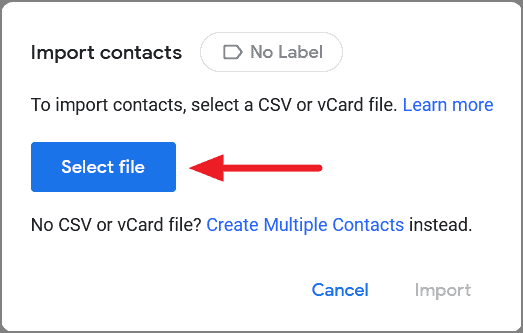 An Import contacts window will appear. There, click the ‘Select file’ button.