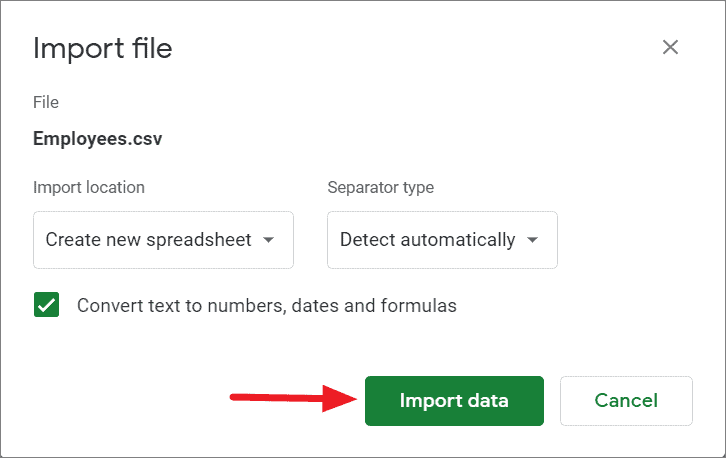 - Create new spreadsheet – Choose this option to create a new spreadsheet file on your Google drive and import your CSV file data into it. The file name will be the same as your CSV file name.