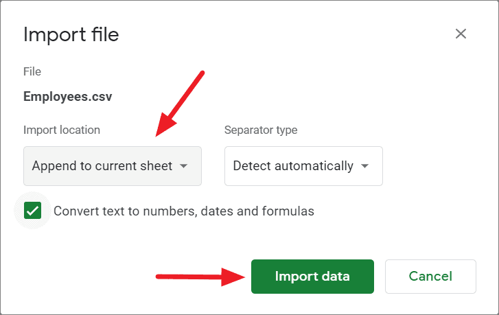- Append to current sheet – Choose this option if you append the CSV file data at the end of the current sheet data.