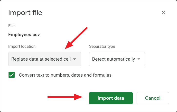 Then, choose the ‘Import’ option from the ‘File’ menu, and select the CSV file. In the ‘Import file’ dialog box, select ‘Replace data at selected cell’ for the Import location and select the ‘Import data’ button.