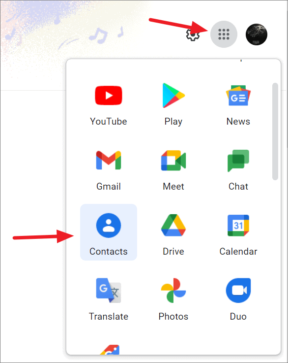 First, open Google Contacts by clicking the waffle button on the Google page and selecting ‘Contacts’ from the drop-down.