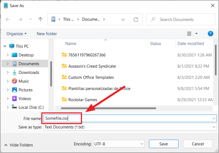 Then, type the name for your file and end the filename with the “.csv” extension.