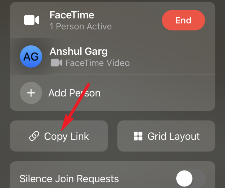 Tap ‘Copy Link’ to copy the FaceTime link for the call. Then, share the link with your contacts.