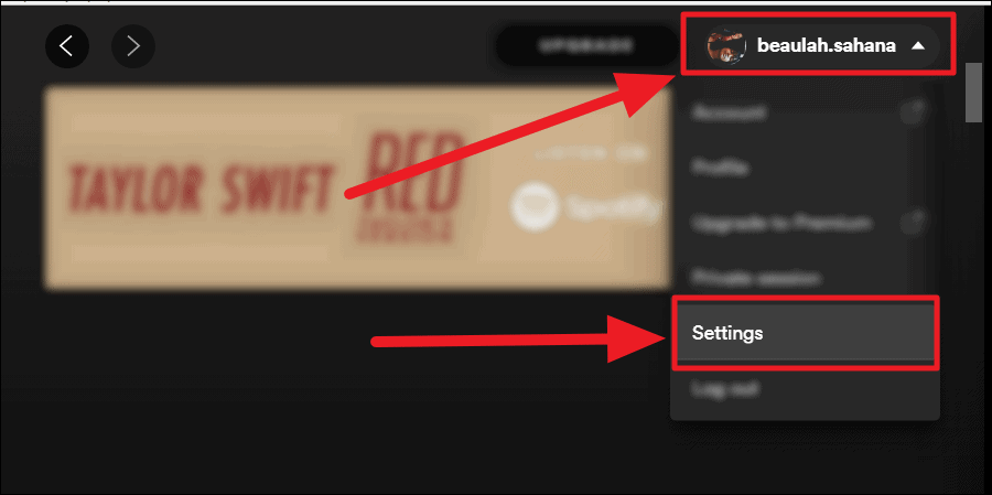 Launch Spotify on your computer and tap your username to the top right of the home screen. Now, select ‘Settings’ from the drop-down.