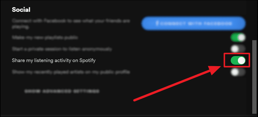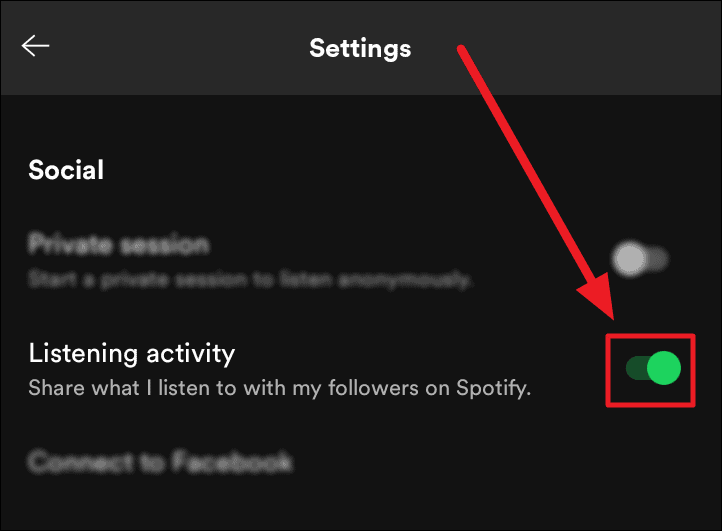 Now, reach the ‘Social’ section on the ‘Settings’ screen and click the toggle next to the option – Share my listening activity on Spotify. A grey toggle corresponds disabling the setting.