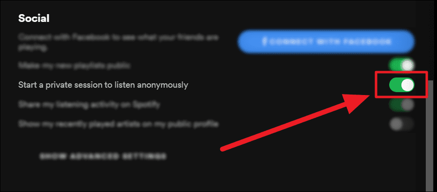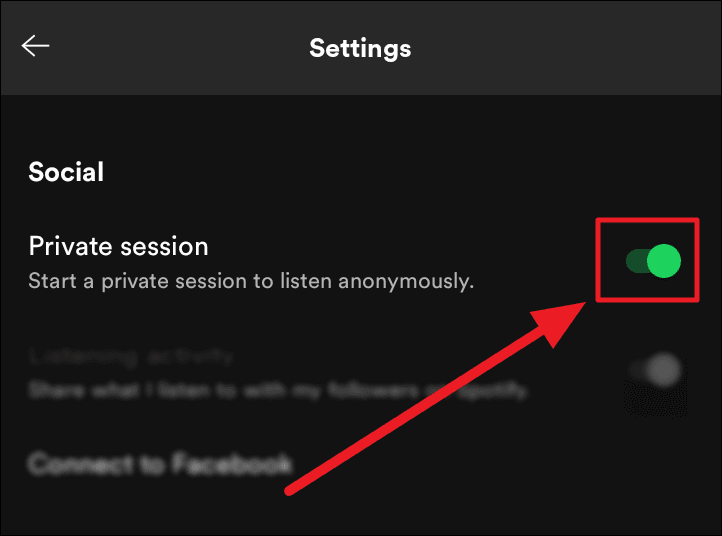 Scroll through the ‘Settings’ page to find the ‘Social’ section. Here, tap the toggle adjacent to the option that says ‘Start a private session to listen anonymously’ to turn it green – thus enabling it.