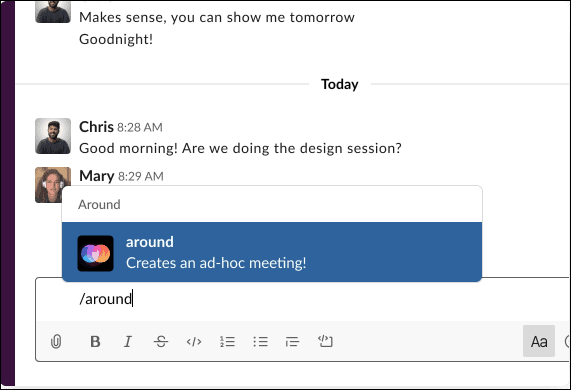 Around also integrates deeply with Slack, where you can start meetings on Around straight from Slack with a simple command.