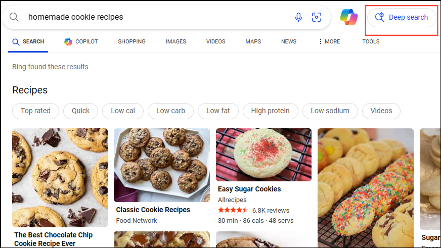 homemade cookie recipes. Make sure your search engine is Bing. - You will see a capsule-shaped button to the right of the search box labeled 'Deep Search'. To use it, simply click on this button and wait for a few seconds.