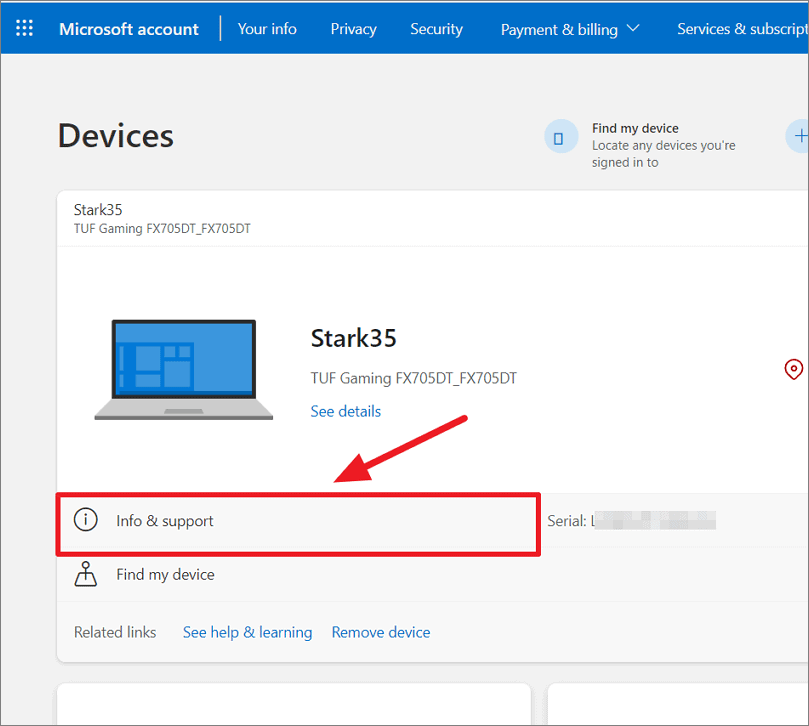Step 2: On the 'Devices' page, locate your device and click on 'Info & support' under your device name.