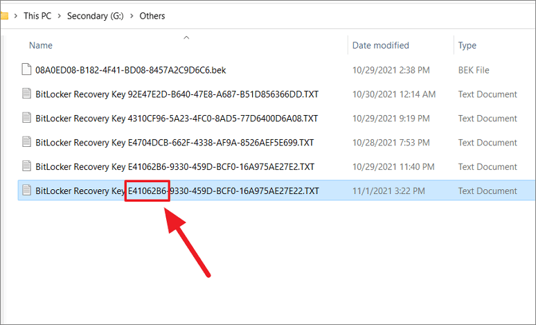 Step 2: Look for a file named similar to 'BitLocker Recovery Key ... .TXT' and open it to retrieve your recovery key.