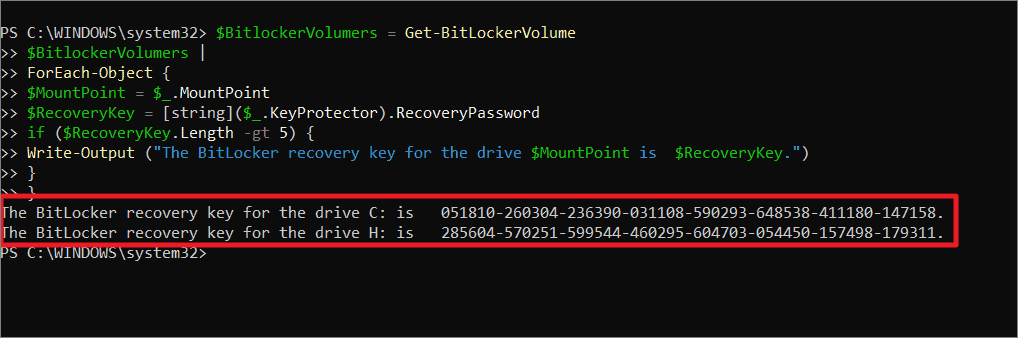 Write-Output "Recovery key for drive $($volume.MountPoint): $($volume.KeyProtector.RecoveryPassword)"