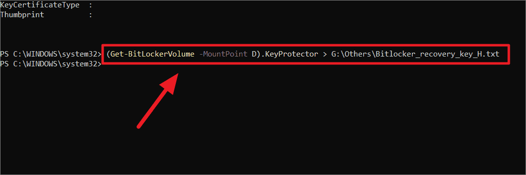Step 4: To save the recovery key to a text file on a specific drive, use the following command: