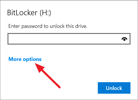 For example, if you're trying to unlock a drive but have forgotten the password, you can click 'More options' and then select 'Enter recovery key'.