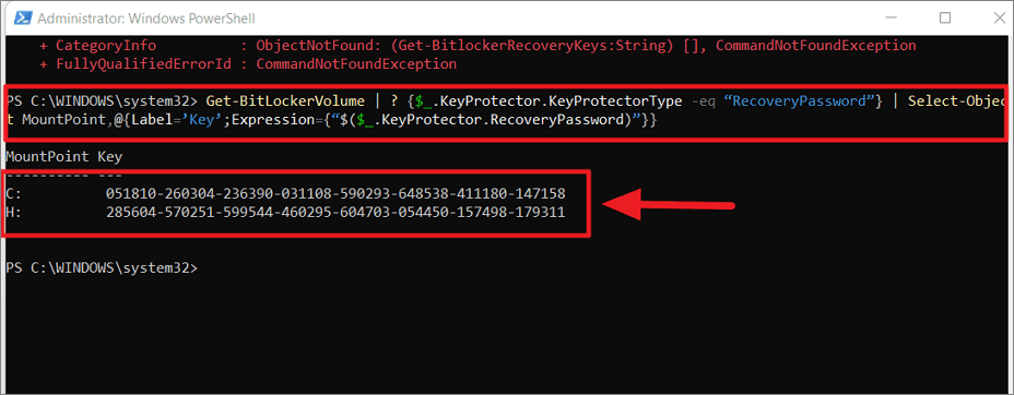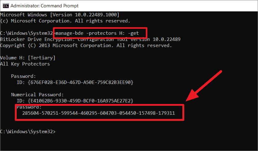Step 2: To retrieve the recovery key for a specific drive, enter the following command: