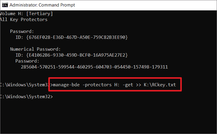 Step 3: To save the recovery key to a text file, use the following command: