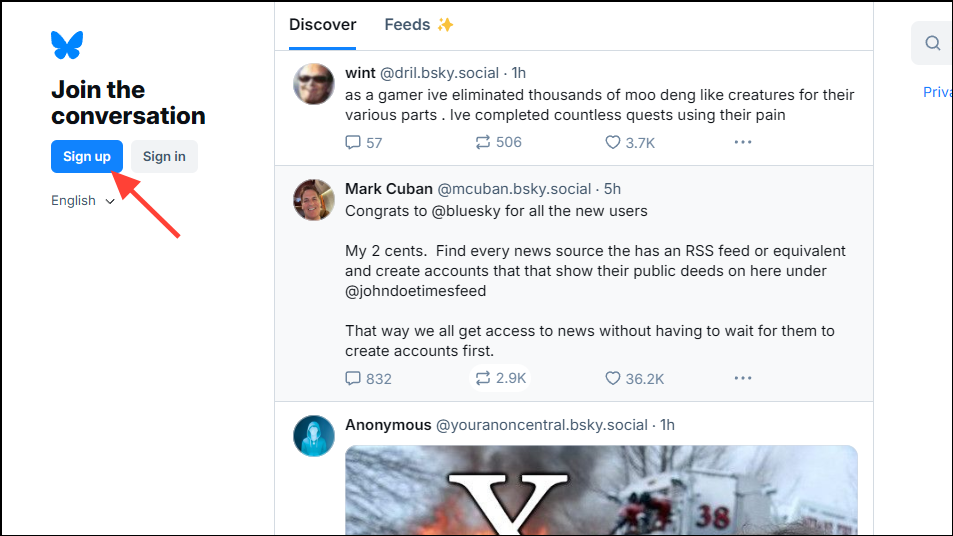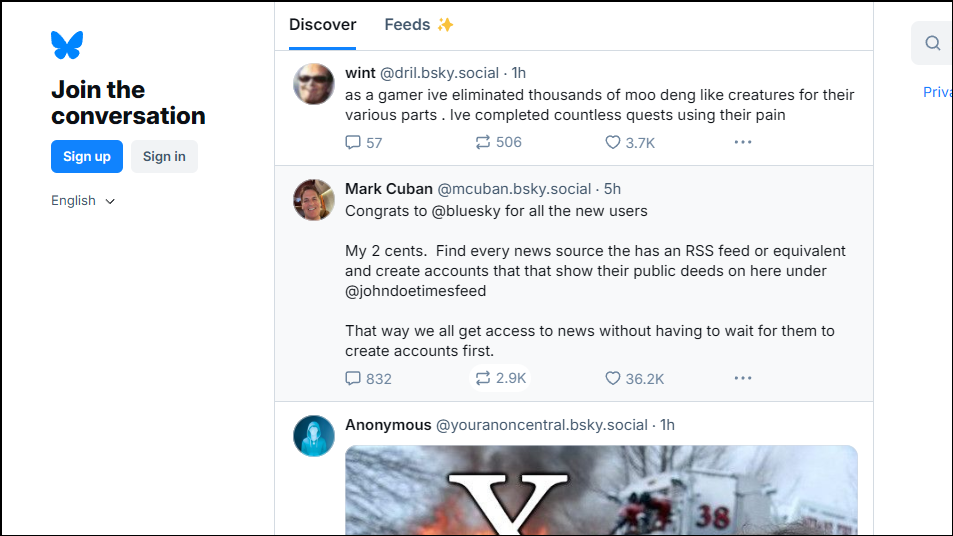 On the Bluesky website, you can browse through and search for posts and view accounts without needing to sign in. By default, the website opens on the Discover page, where you can read the latest posts and search for specific ones by entering a word or phrase. However, if you want to fully experience what the platform has to offer, signing up for an account is the way to go.