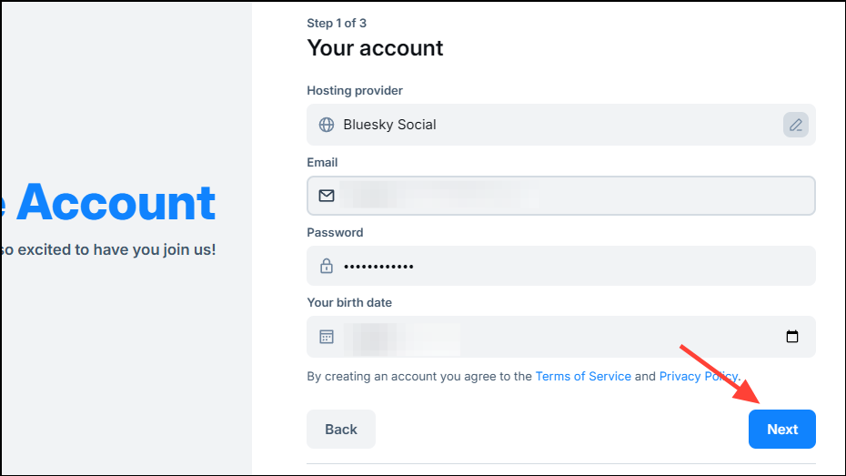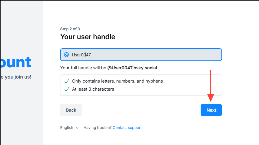 - On the next page, you will need to create a user handle. On Bluesky, your handle will include your name and