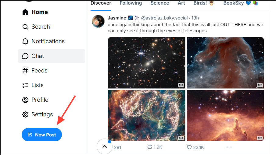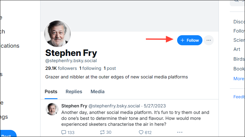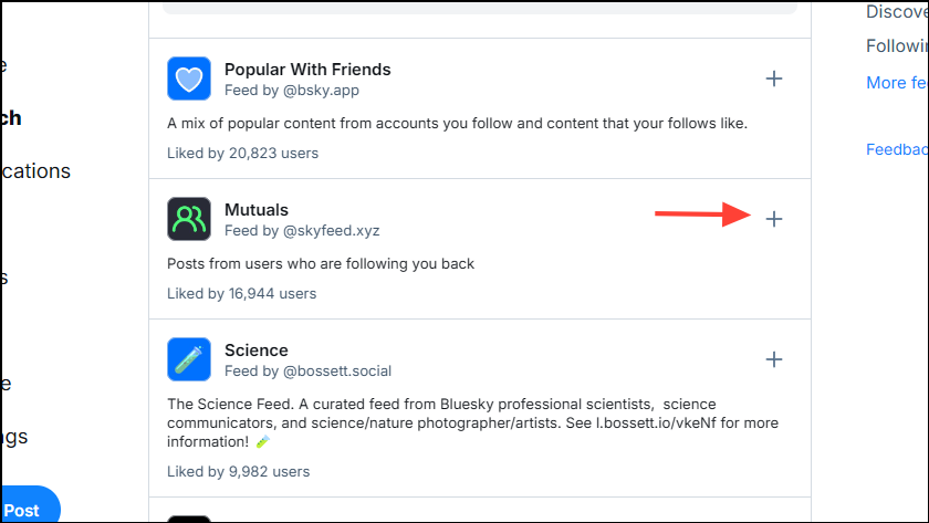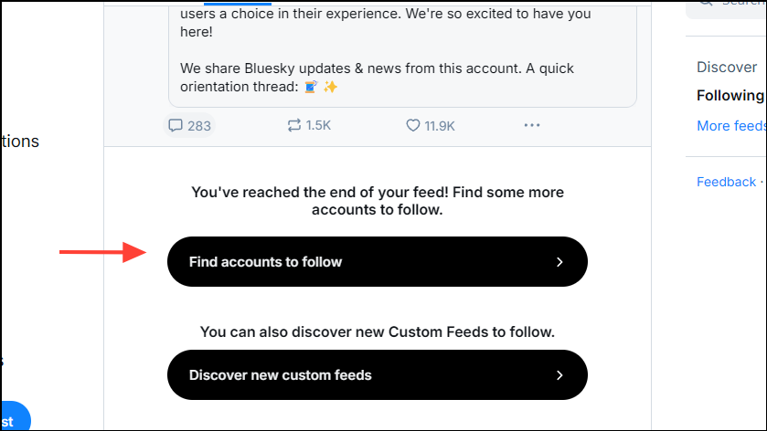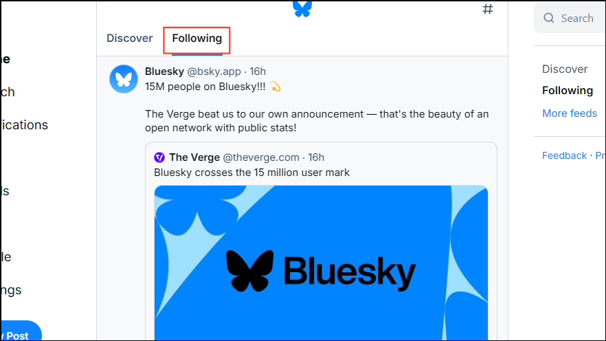 - The Discover feed features the most popular posts and users on Bluesky, making it easy to follow them. You can also switch between different feeds from here by clicking on them, just as you swipe right on the mobile app.